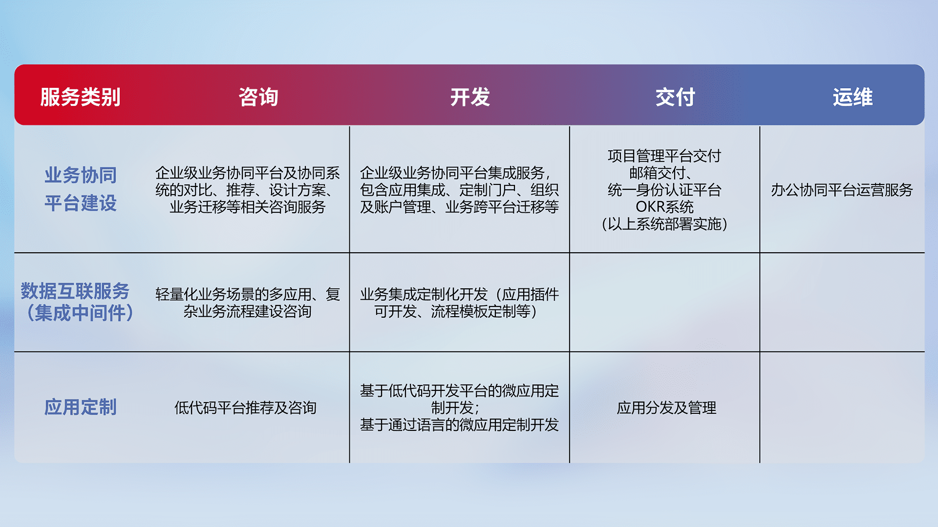 针对钉钉、、、、企微、、、、IDaas等平台级产品提供产品的规划、、、、方案、、、、交付、、、、定制化开发等服务,,,,实现如统一协同办公、、、智能客户服务、、、、混合会议管理、、、、智能数据查询、、等业务场景,,,,实现数字化转型。。