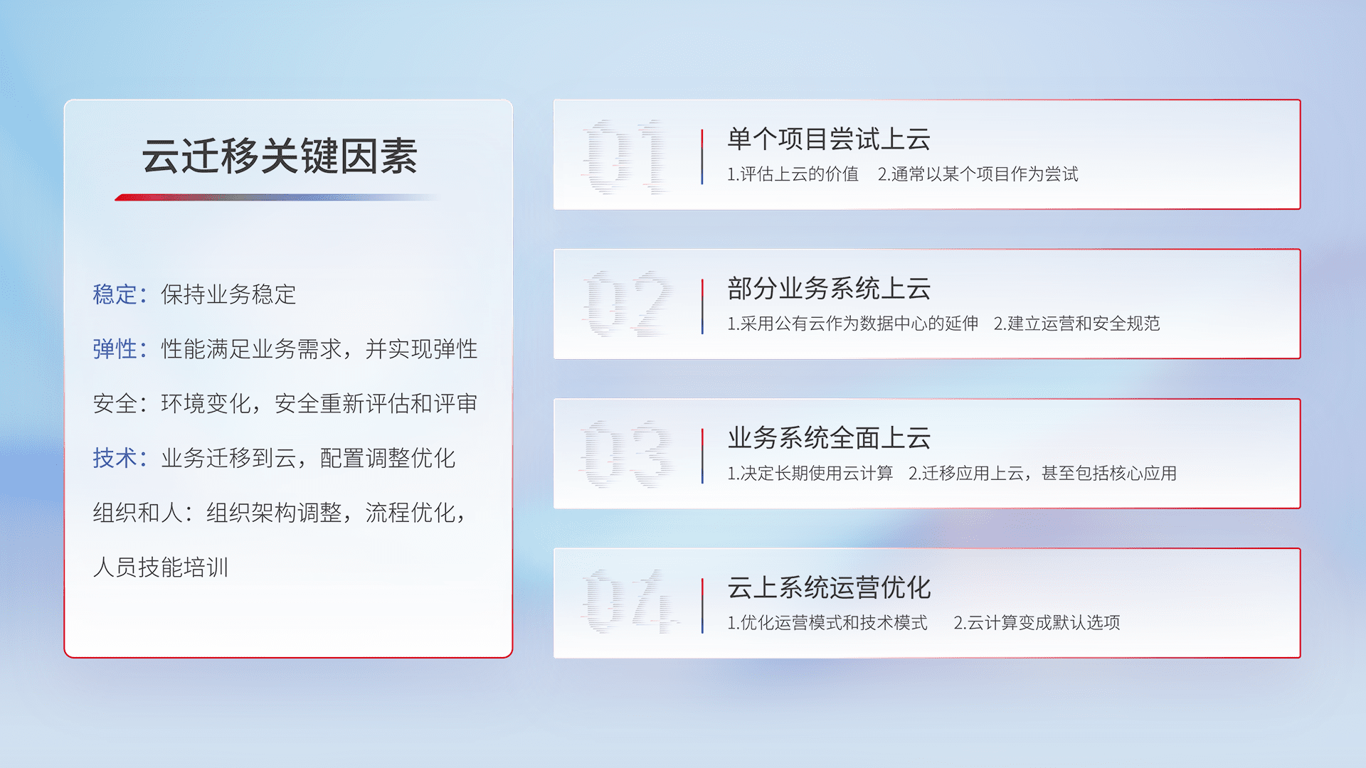 结合实际业务,,从规划设计、、、、云平台选型、、云原生改造、、、、数据迁移、、、集成交付,,迁移全过程为客户识别最佳上云路径,,,做好风险识别管理,,,,设计网络架构、、、、身份权限、、、安全审计合规、、操作审计、、、、日志审计、、、监控告警策略、、、多站点容灾设计等,,,对云上基础设施进行整体规划,,,,提升IT治理水平,,,以满足弹性、、、高可用、、高性能的需求。。。