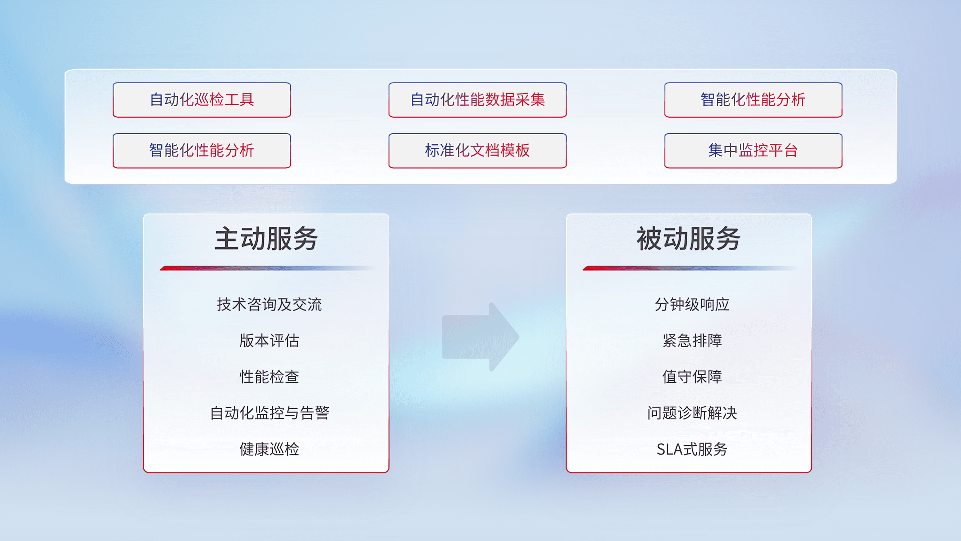 智能化工具和标准化文档,,保障服务质量,,,提供主动服务(包含技术咨询、、、版本评估、、、性能检查、、自动化监控与告警、、、、健康巡检)和被动服务包含(分钟级响应、、紧急排障、、、、值守保障、、、、问题诊断解决、、、、SLA服务)。。