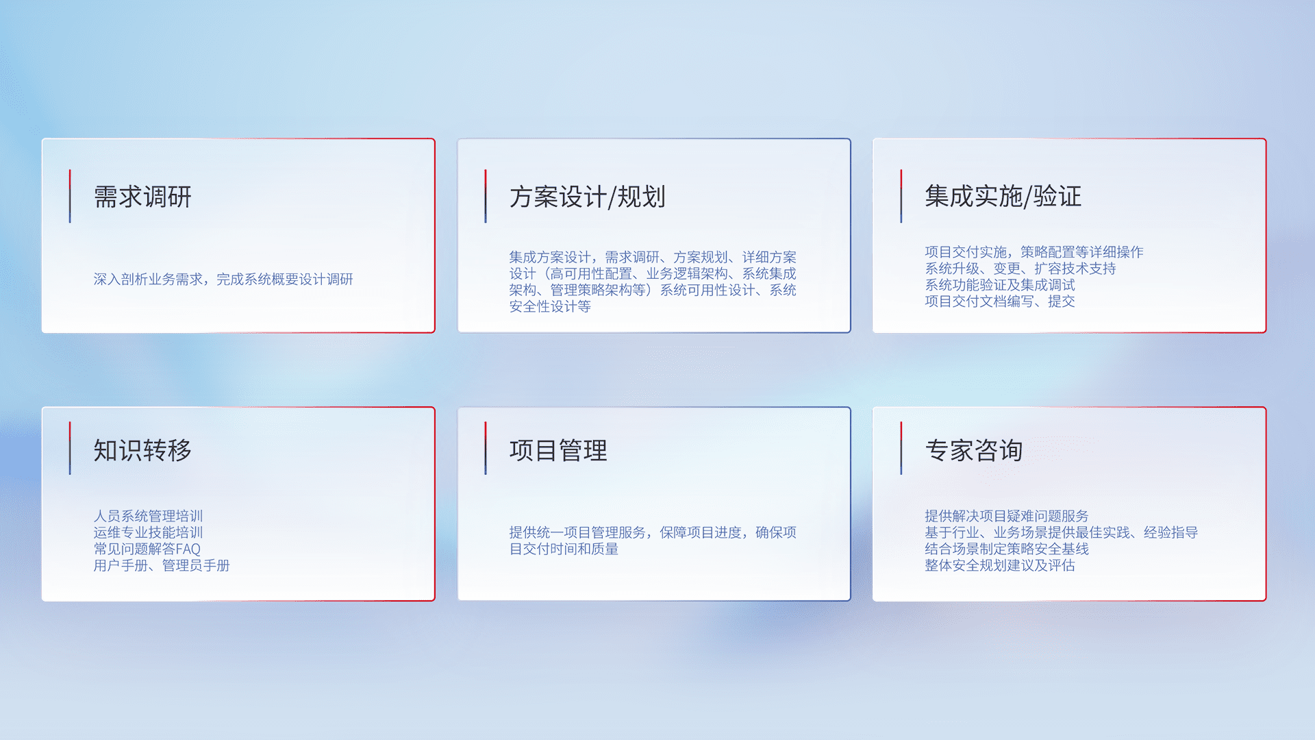 针对客户行业特性,,,将宏观的安全战略和需求,,,,通过专业的交付服务,,实现项目落地,,,,为客户提供标准规范的集成交付服务。。。。